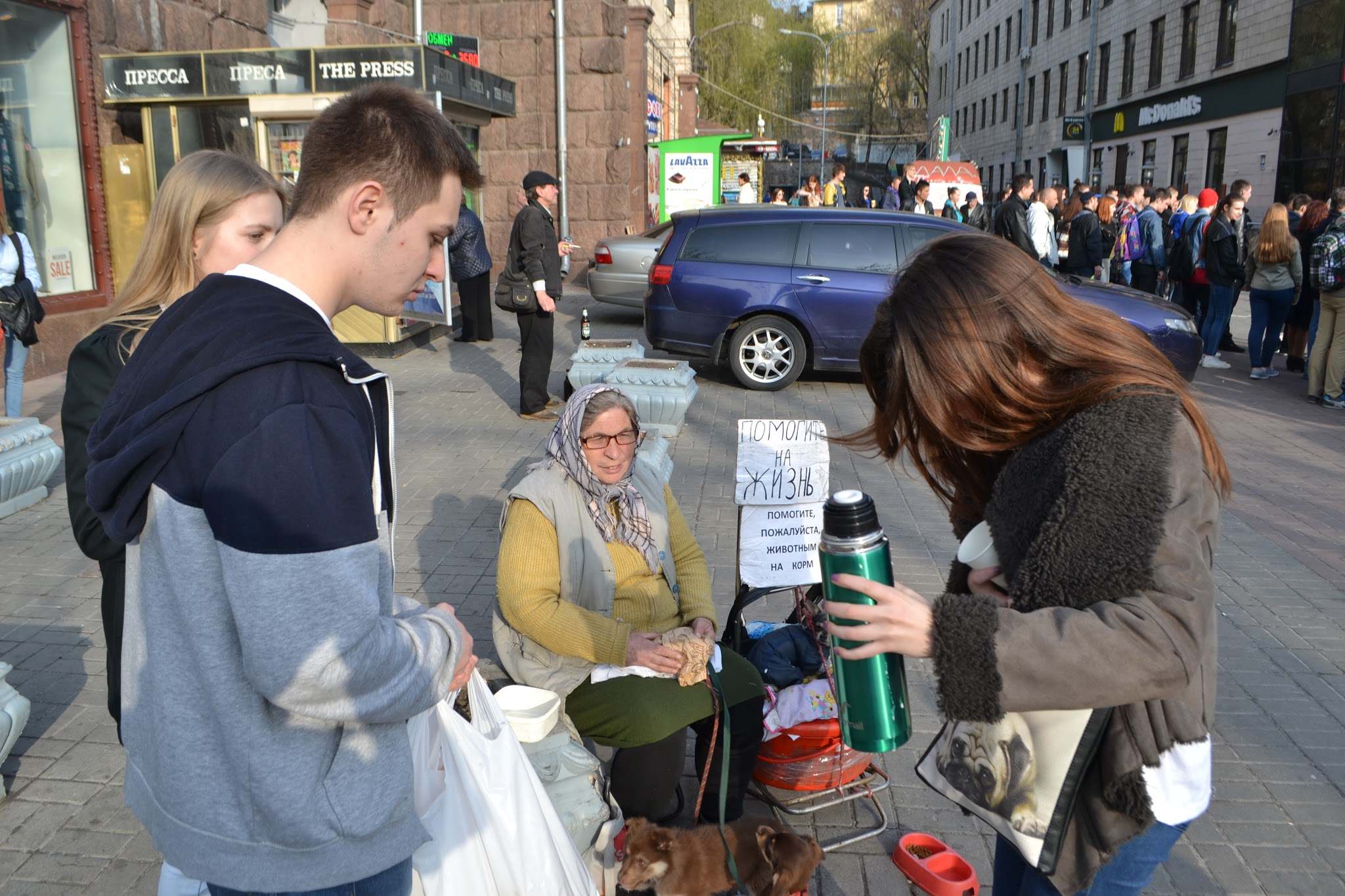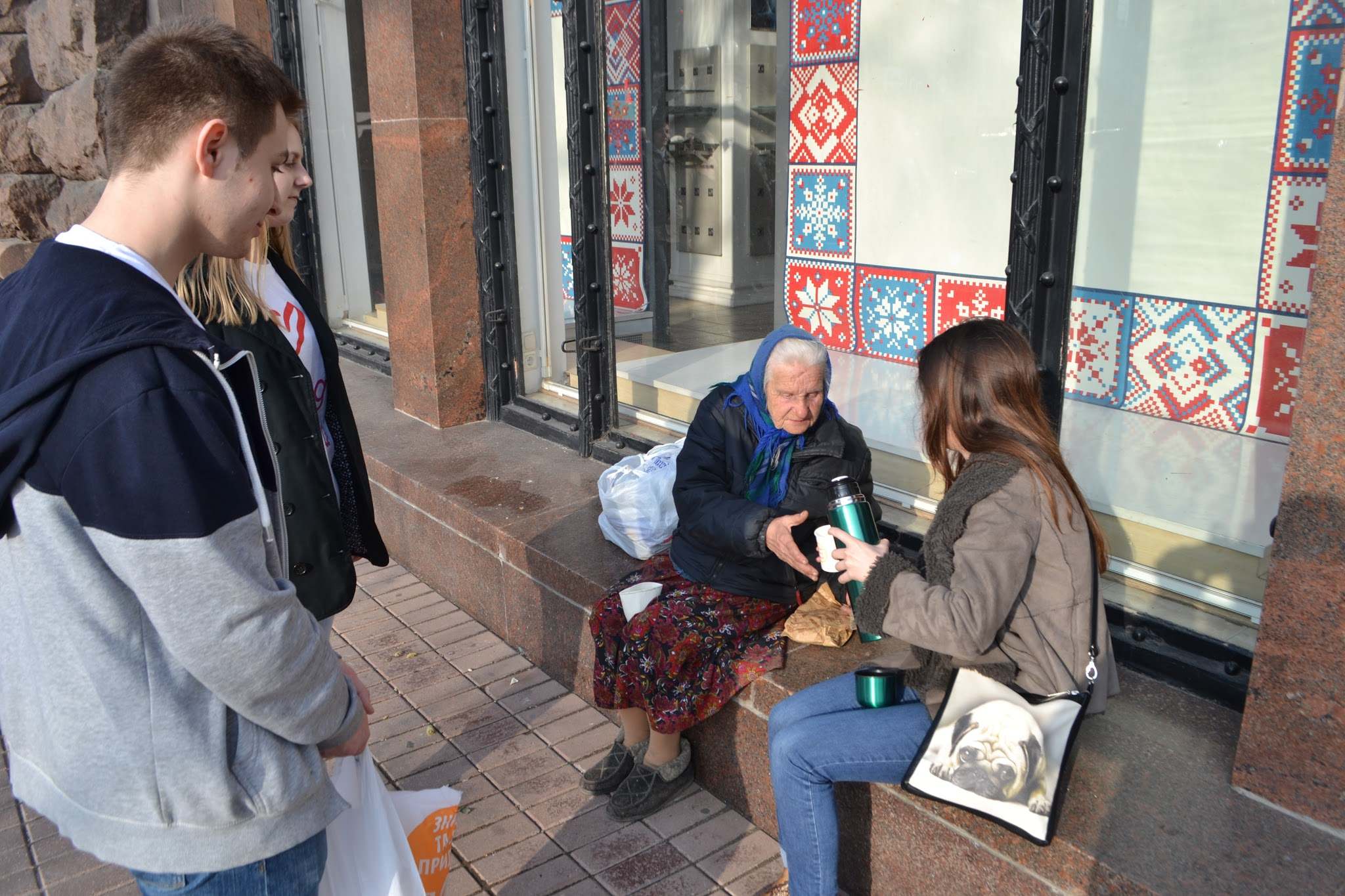 Одним из наших добрых дел была помощь бездомным и нуждающимся. Люди которые не имеют дома либо достаточных средств к существованию нуждаются в помощи, в еде и вещах. Волонтеры угощали их горячим чаем и булочками. Проходя по центру Киева они встретили довольно много таких людей. Грустно осознавать сколько людей в нашей стране находятся в таком положении.