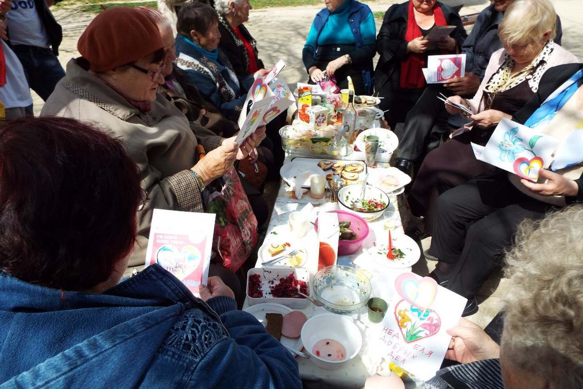 На чаепитие с ветеранами, которое было организовано в одном из дворов города выступили дети, провели конкурсы и подарили подарки самым активным участникам. В завершении этого мероприятия были вручены открытки, которые дети сделали сами.