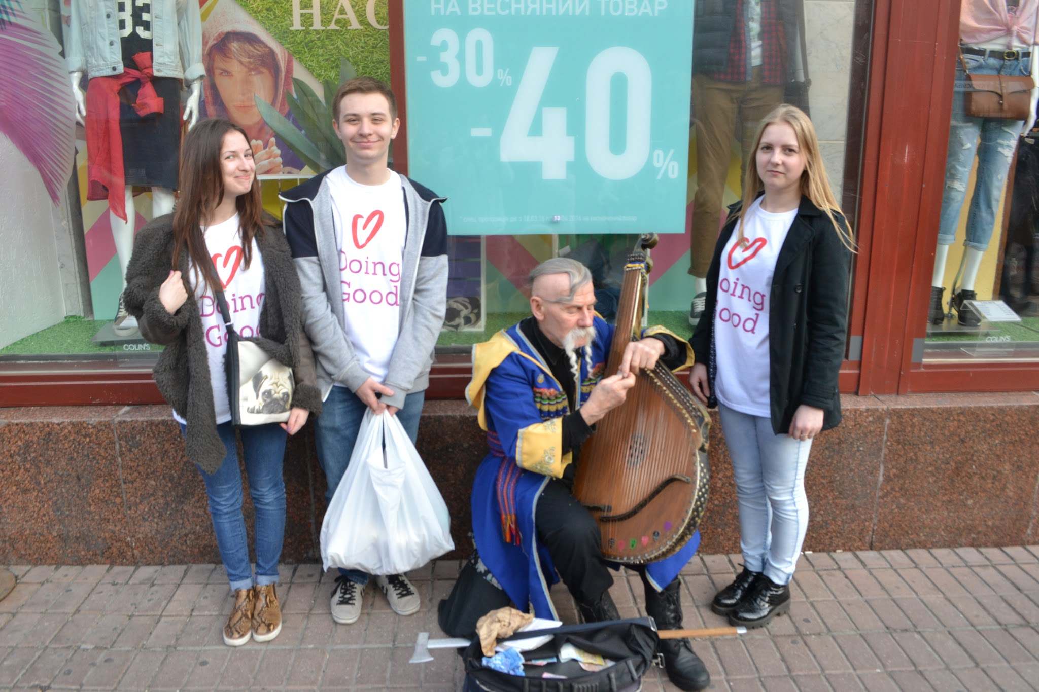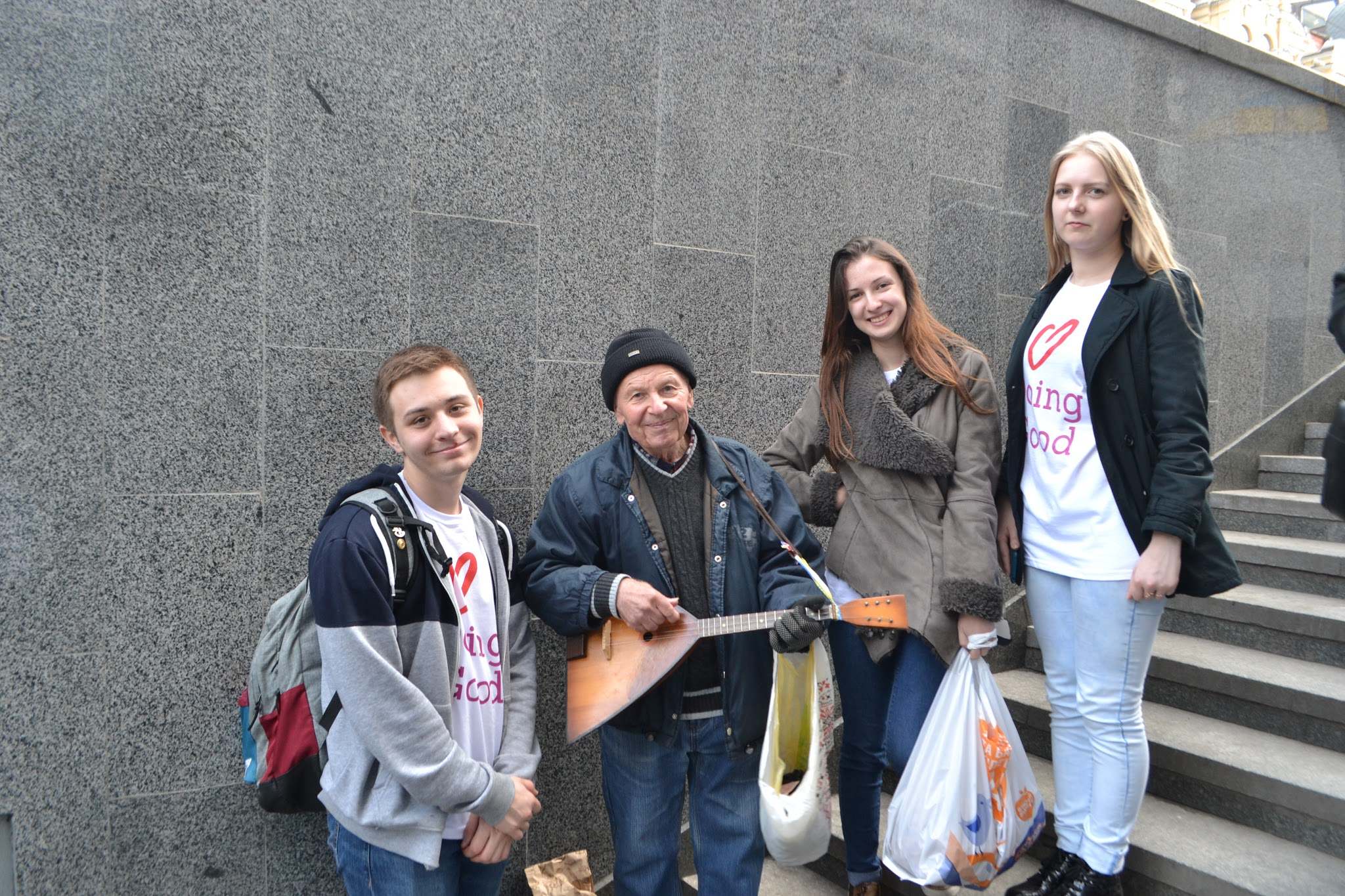 Одним из наших добрых дел была помощь бездомным и нуждающимся. Люди которые не имеют дома либо достаточных средств к существованию нуждаются в помощи, в еде и вещах. Волонтеры угощали их горячим чаем и булочками. Проходя по центру Киева они встретили довольно много таких людей. Грустно осознавать сколько людей в нашей стране находятся в таком положении.